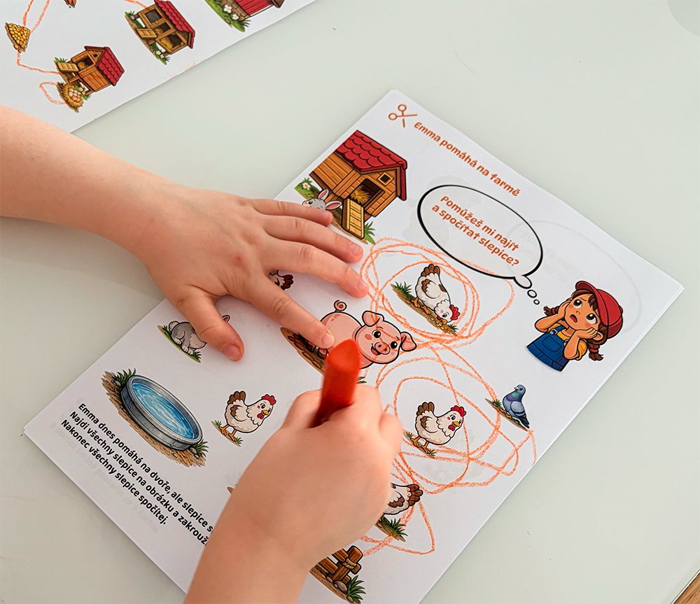 Balíček 4 zábavných úkolů z farmářského prostředí, které kombinují logické myšlení a jemnou motoriku při stříhání.